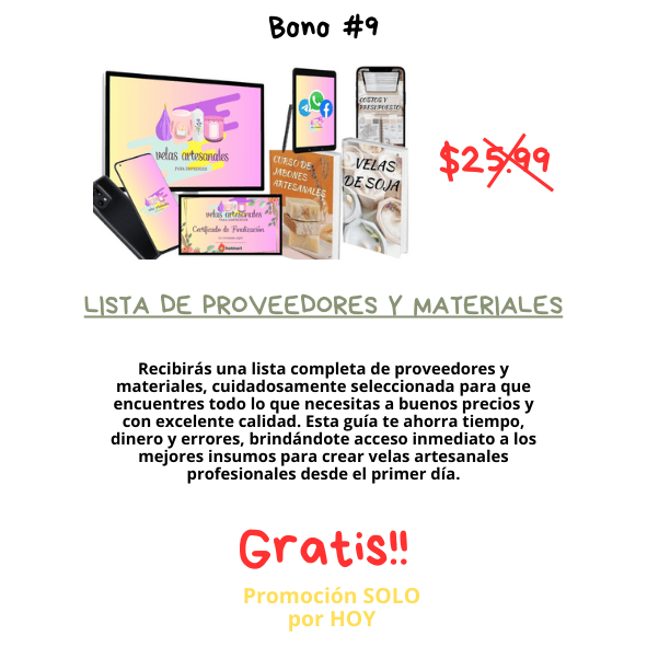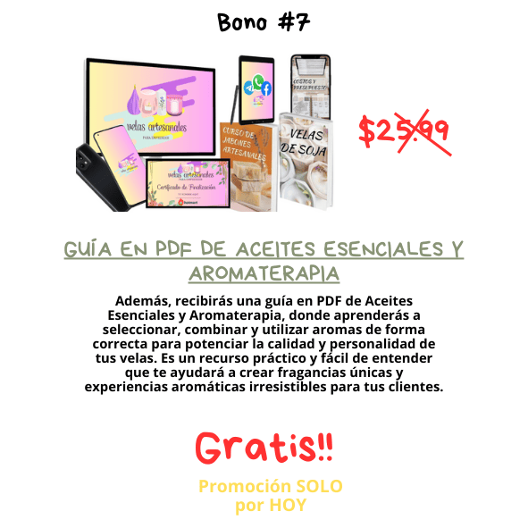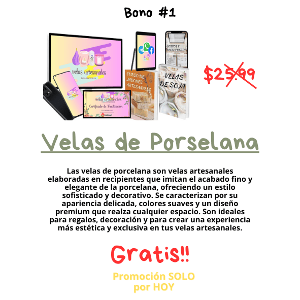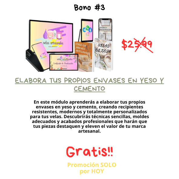 – Recibirás un curso completo de velas artesanales que te enseña desde la teoría esencial, el uso correcto de ceras, fragancias, colorantes y pabilos, hasta la creación de más de 40 tipos de velas profesionales, incluyendo velas en gel, tipo postre, marmoleadas, en moldes, capas, flores, masaje y mucho más. También obtendrás módulos avanzados para emprender: precios, branding, fotografía, contenido, ventas en redes sociales y estrategias de publicidad. Además, incluye bonos exclusivos como elaboración de envases en yeso y cemento, creación de moldes de silicona, fanales personalizados, aromaterapia, aceites esenciales, lista de proveedores, calculadora de costos y certificado final. Este programa te da todo lo necesario para aprender, crear y emprender tu propia marca de velas desde cero.